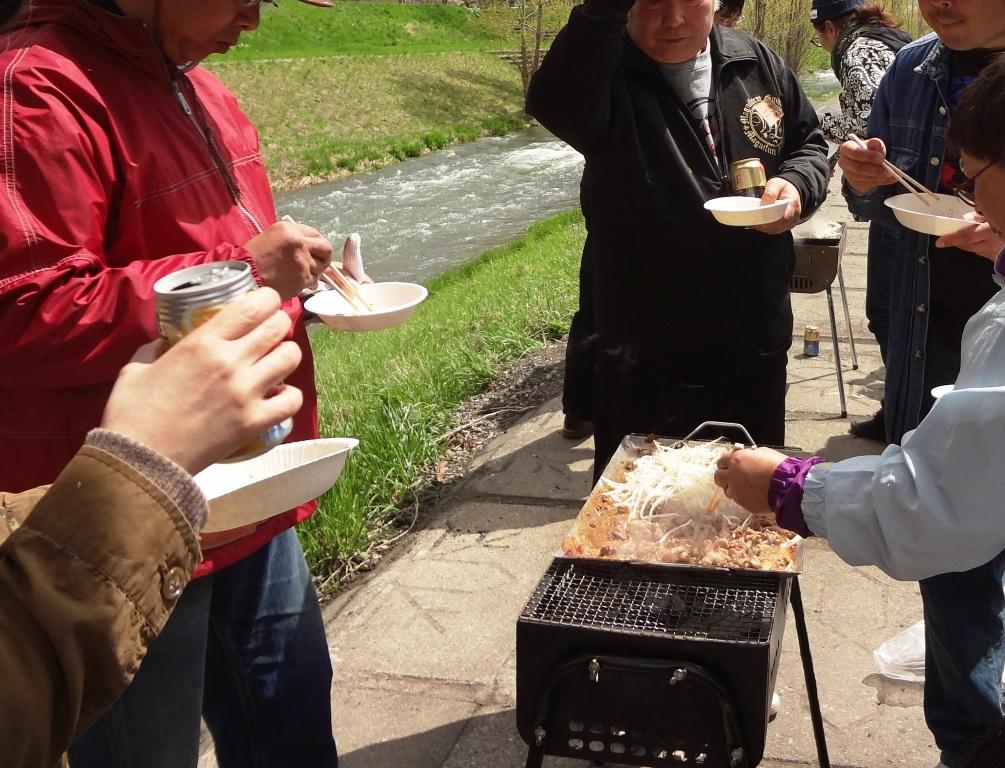 今年は例年よりも春の訪れが早く、桜の見頃は過ぎていましたが、しかも、前夜からの大雨で天候も危ぶまれる中、いつもの農試公園河川敷で決行。でも、皆の普段の行いが良いせいか?始まる頃には好天になり、バーベキュー、ゲームと大盛り上がりでした。