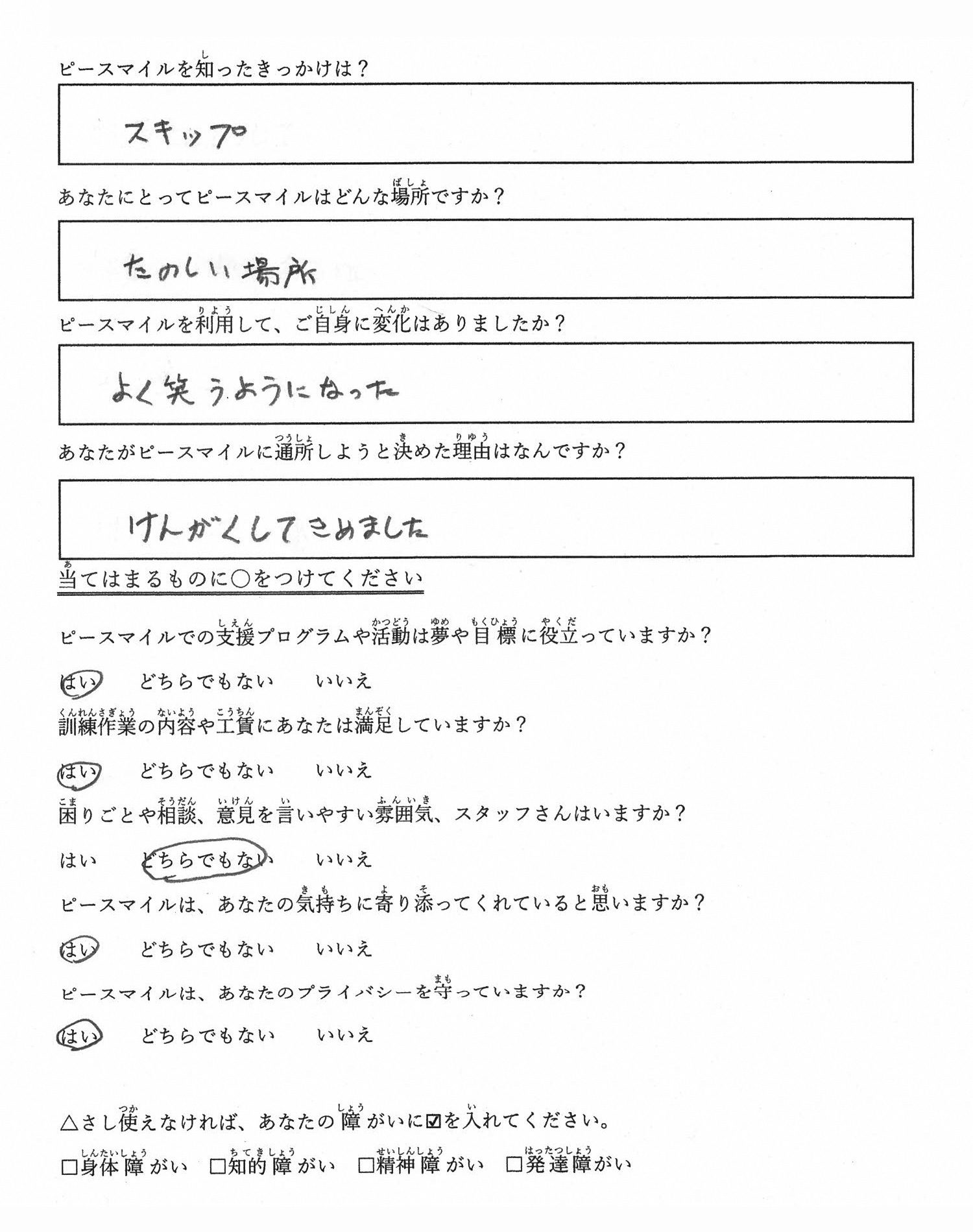 T.Kさん (50代) 2021年3月 利用開始 ピースマイルはどんな場所? たのしい場所 ピースマイル利用後の変化? よく笑うようになった ■メンバーさんアンケート 利用者さんアンケート Top NEXT