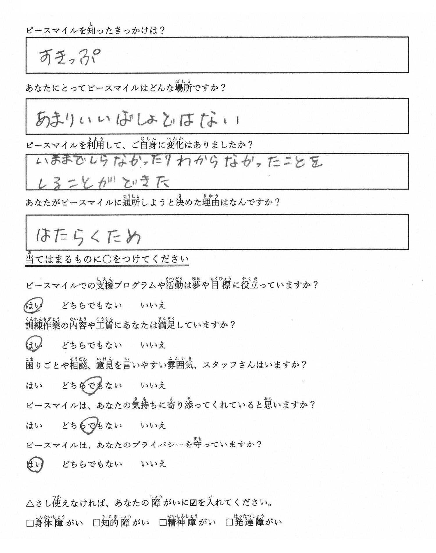 E.Oさん (60代) 2020年11 月 利用開始 ピースマイルはどんな場所? あまりいいばしょではない ピースマイル利用後の変化? いままでしらなかったりわからなかったりことをしることができた ■メンバーさんアンケート PREV 利用者さんアンケート Top NEXT