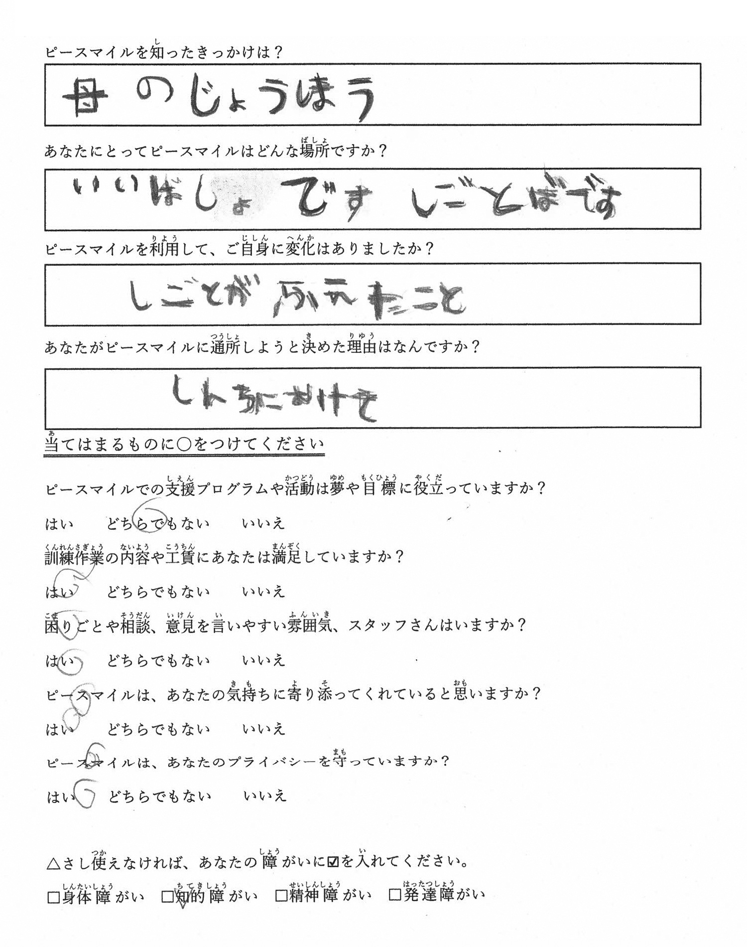 R.Nさん (20代) 2015年4月 利用開始 ピースマイルはどんな場所? いいばしょです しごとばです ピースマイル利用後の変化? しごとがふれたこと ■メンバーさんアンケート PREV 利用者さんアンケート Top NEXT