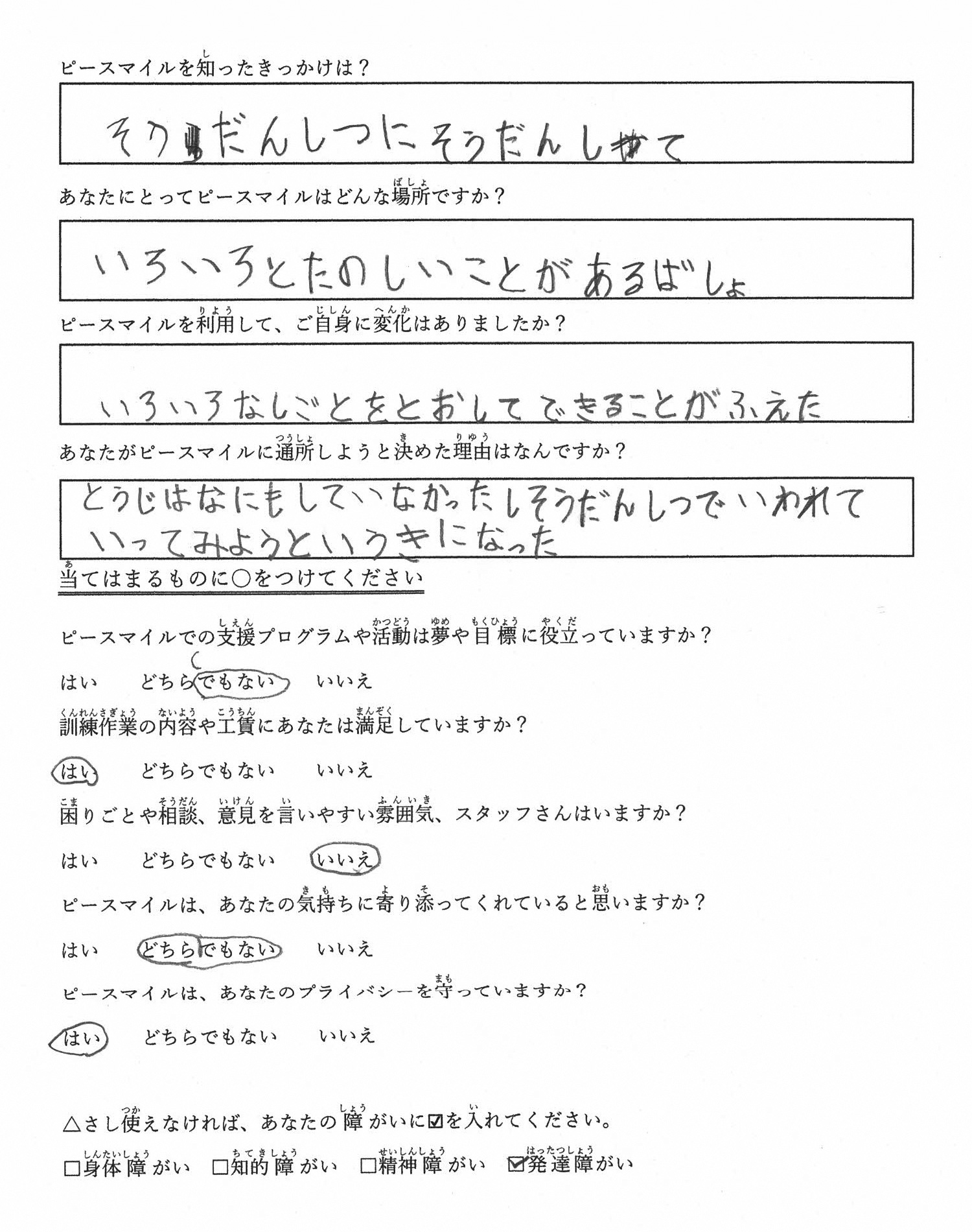 H.Nさん (60代) 2014年 利用開始 ピースマイルはどんな場所? いろいろとたのしいことがあるばしょ ピースマイル利用後の変化? いろいろなしごとをとおしてできることがふえた ■メンバーさんアンケート PREV 利用者さんアンケート Top NEXT