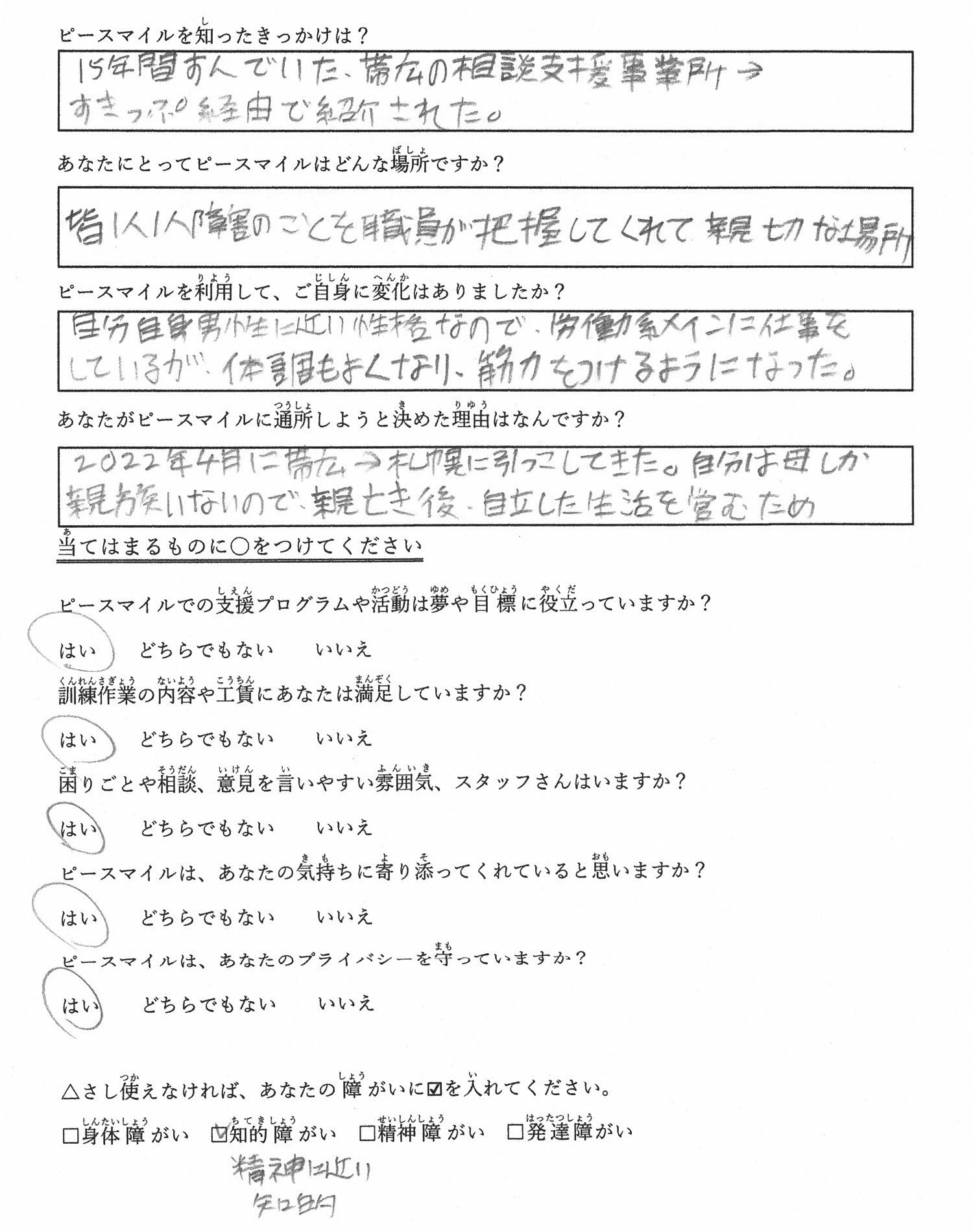 S.Tさん (40代) 2022年5月 利用開始 ピースマイルはどんな場所? 皆1人1人障害のことを職員が把握してくれて 親切な場所 ピースマイル利用後の変化? 自分自身男性に近い性格なので、労働系メインに仕事をしているが体調もよくなり、筋力をつけるようになった ■メンバーさんアンケート PREV 利用者さんアンケート Top NEXT
