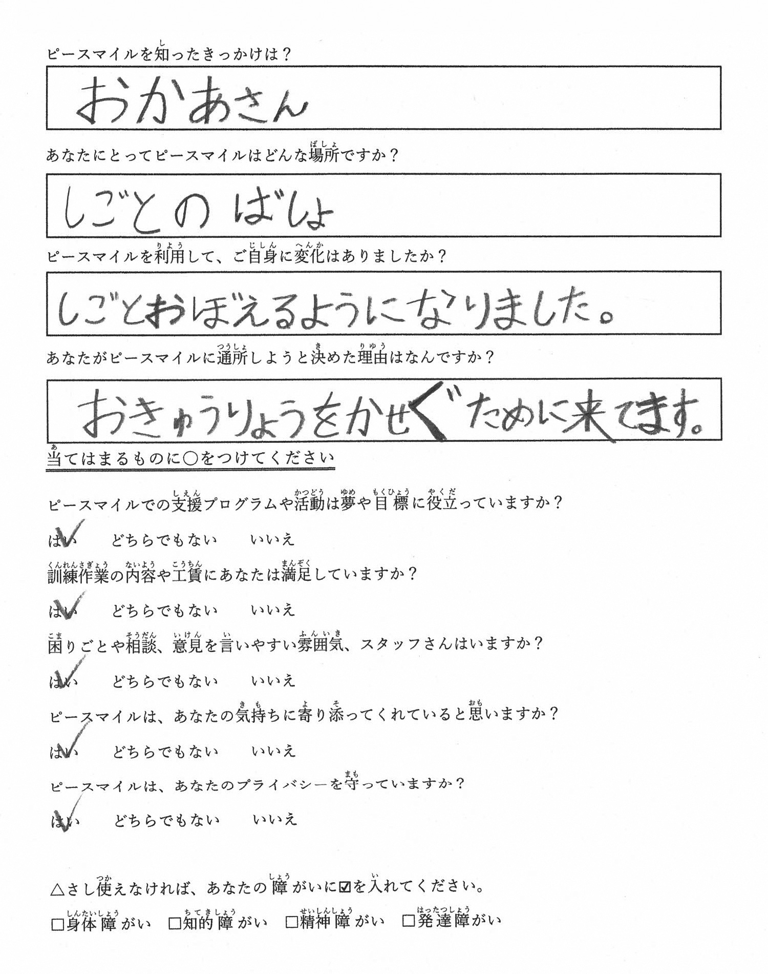 R.Iさん (20代) 2023年3月 利用開始 ピースマイルはどんな場所? しごとのばしょ ピースマイル利用後の変化? しごとおぼえるようになりました。 ■メンバーさんアンケート PREV 利用者さんアンケート Top NEXT